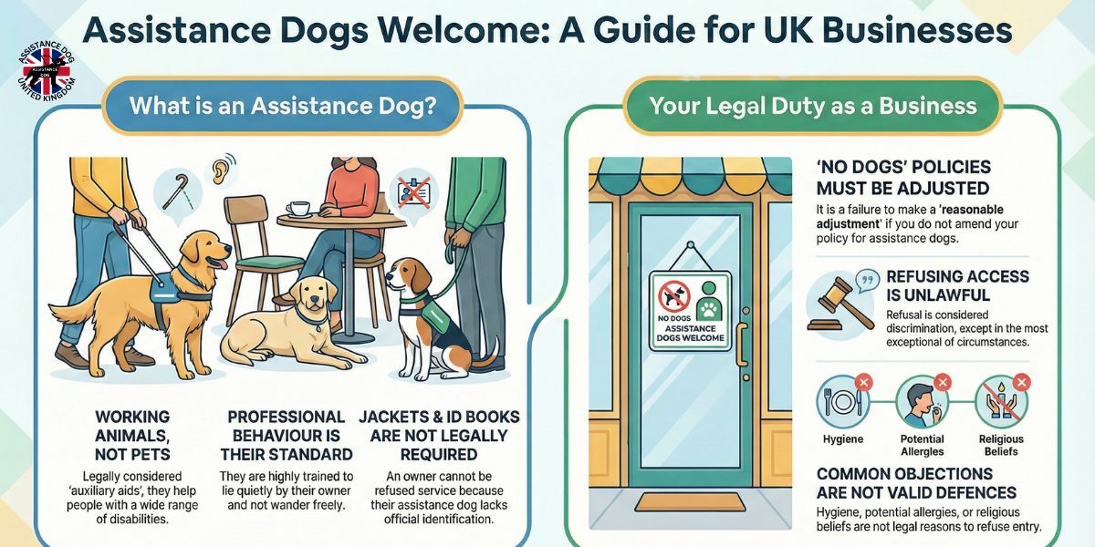 Under the Equality Act 2010, a disabled person has the right to be accompanied by an assistance dog in most public places. This right exists regardless of paperwork.